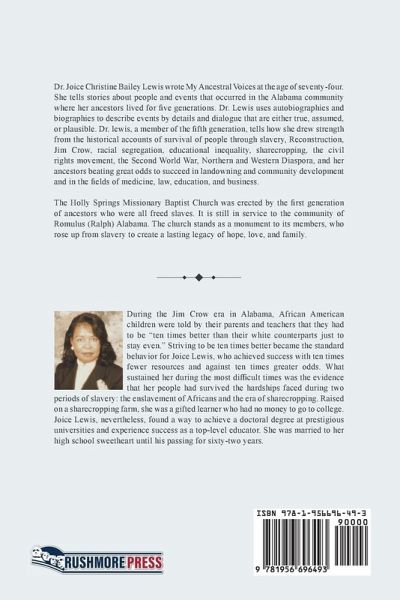 Dr. Joice Christine Bailey Lewis wrote My Ancestral Voices at the age of seventy-four. She tells stories about people and events that occurred in the Alabama community where her ancestors lived for five generations. Dr. Lewis uses autobiographies and biographies to describe events by details and dialogue that are either true, assumed, or plausible. Dr. lewis, a member of the fifth generation, tells how she drew strength from the historical accounts of survival of people through slavery, Reconstruction, Jim Crow, racial segregation, educational inequality, sharecropping, the civil rights movement, the Second World War, Northern and Western Diaspora, and her ancestors beating great odds to succeed in landowning and community development and in the fields of medicine, law, education, and business. The Holly Springs Missionary Baptist Church was erected by the first generation of ancestors who were all freed slaves. It is still in service to the community of Romulus (Ralph) Alabama. The church stands as a monument to its members, who rose up from slavery to create a lasting legacy of hope, love, and family.