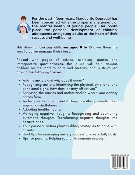 This diary for anxious children aged 8 to 13 gives them the keys to better manage their stress. Rich with many pages of advice, exercises, quotes and introspective quizzes, this guide will accompany anxious children on the path to peace and serenity and addresses the following themes: What is anxiety? How does it express itself? How to analyze the causes of anxiety? How to block negative thoughts by using breathing, visualization, yoga and mindfulness exercises How to develop positive thoughts and gratitude How to establish healthy habits and routines to manage stress How to fight negative thoughts by learning how to respond to them These negative thoughts are:"I can't" "I should" or "you should" "It's my fault" or "It's his fault" "It's not fair" Catastrophism Negative exaggeration To believe that you can read minds To believe that you can guess the future All or nothing.