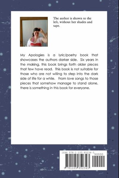 My Apologies is a lyric/poetry book that showcases the authors darker side. Six years in the making, this book brings forth older pieces that few have read. This book is not suitable for those who aren't willing to step into the dark side of life for a while. From love songs to those pieces that somehow manage to stand alone, there is something in this book for everyone.