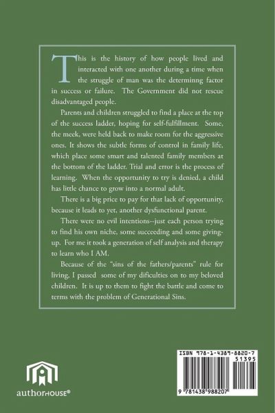 This is the history of how people lived and interacted with one another during a time when the struggle of man was the determinng factor in success or failure. The Government did not rescue disadvantaged people. Parents and children struggled to find a place at the top of the success ladder, hoping for self-fulfillment. Some, the meek, were held back to make room for the aggressive ones. It shows the subtle forms of control in family life, which place some smart and talented family members at the bottom of the ladder. Trial and error is the process of learning. When the opportunity to try is denied, a child has little chance to grow into a normal adult. There is a big price to pay for that lack of opportunity, because it leads to yet, another dysfunctional parent. There were no evil intentions--just each person trying to find his own niche, some succeeding and some giving-up. For me it took a generation of self analysis and therapy to learn who I AM. Because of the "sins of the fathers/parents" rule for living, I passed some of my dificulties on to my beloved children. It is up to them to fight the battle and come to terms with the problem of Generational Sins.