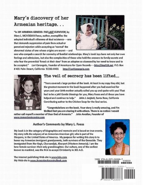 A primal scream erupted in the Charity Ward of Providence Hospital in Washington, DC. Crying out for Mother,baby Movsisian felt her loving grip for only minutes after birth. Judy's bassinet was wheeled away, then hidden, once her birth blood was washed away. Her family was nearly destroyed in the Armenian Genocide; only 5 survived from Nor Kegh, Charsandjak, Kharpert, in the Euphrates River Valley. They emigrated to the U.S.A. in 1913 and 1921. Fate determined that this newborn would be the last one to inherit the family name. Cloaked in secrecy, Mary's identity remained a secret from her until she was 38! Mary did not know that Armenians had origins from the Cradle of Civilization and were the first people to accept Christianity.Her birth records were sealed, then falsified. How did she find her family? Mary's tenacity resulted in her discovering 'something.' How did THE LETTER, written 9-17-1945, and hidden inside an old box in a closet, yet found by accident 42 years later, solve Mary's mystery?