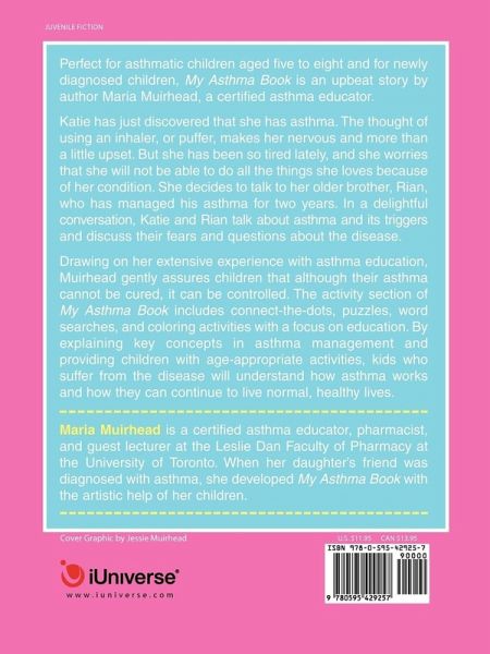 Perfect for asthmatic children aged five to eight and for newly diagnosed children, My Asthma Book is an upbeat story by author Maria Muirhead, a certified asthma educator. Katie has just discovered that she has asthma. The thought of using an inhaler, or puffer, makes her nervous and more than a little upset. But she has been so tired lately, and she worries that she will not be able to do all the things she loves because of her condition. She decides to talk to her older brother, Rian, who has managed his asthma for two years. In a delightful conversation, Katie and Rian talk about asthma and its triggers and discuss their fears and questions about the disease. Drawing on her extensive experience with asthma education, Muirhead gently assures children that although their asthma cannot be cured, it can be controlled. The activity section of My Asthma Book includes connect-the-dots, puzzles, word searches, and coloring activities with a focus on education. By explaining key concepts in asthma management and providing children with age-appropriate activities, kids who suffer from the disease will understand how asthma works and how they can continue to live normal, healthy lives.