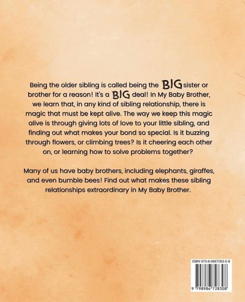 Being the older sibling is called being the big sister or brother for a reason! It's a big deal! In My Baby Brother, we learn that, in any kind of sibling relationship, there is magic that must be kept alive. The way we keep this magic alive is through giving lots of love to your little sibling, and finding out what makes your bond so special. Is it buzzing through flowers, or climbing trees? Is it cheering each other on, or learning how to solve problems together? Many of us have baby brothers, including elephants, giraffes, and even bumble bees! Find out what makes these sibling relationships extraordinary in My Baby Brother.
