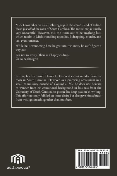 Mick Davis takes his usual, relaxing trip to the scenic island of Hilton Head just off of the coast of South Carolina. The annual trip is usually very uneventful. However, this trip turns out to be anything but, which results in Mick stumbling upon lies, kidnapping, murder, and yes, even romance. While he is wondering how he got into this mess, he can't figure a way out. But not to worry. There is a happy ending. Or so he thought!