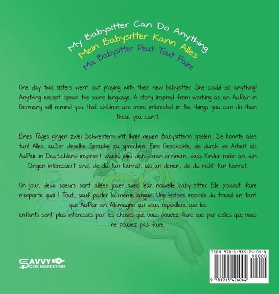 One day two sisters went out playing with their new babysitter. She could do anything! Anything except speak the same language. A story inspired from working as an AuPair in Germany will remind you that children are more interested in the things you can do than those you can't. Eines Tages gingen zwei Schwestern mit ihrer neuen Babysitterin spielen. Sie konnte alles tun! Alles, außer dieselbe Sprache zu sprechen. Eine Geschichte, die durch die Arbeit als AuPair in Deutschland inspiriert wurde, wird dich daran erinnern, dass Kinder mehr an den Dingen interessiert sind, die du tun kannst, als an denen, die du nicht tun kannst. Un jour, deux soeurs sont allées jouer avec leur nouvelle baby-sitter. Elle pouvait faire n'importe quoi ! Tout, sauf parler la même langue. Une histoire inspirée du travail en tant que AuPair en Allemagne qui vous rappellera que les enfants sont plus intéressés par les choses que vous pouvez faire que par celles que vous ne pouvez pas faire.