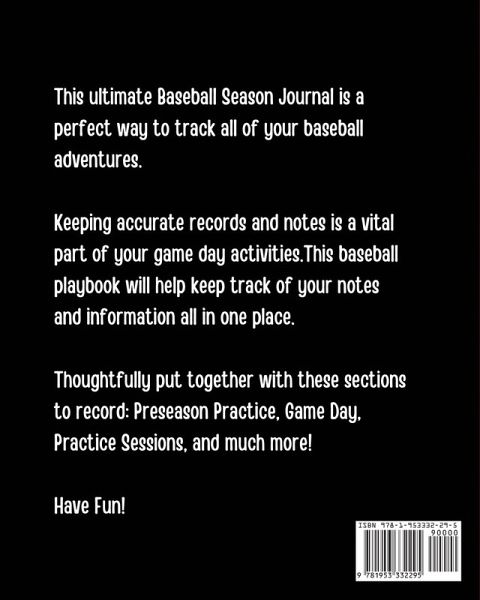 Score a HOMERUN with this awesome "MY BASEBALL SEASON LOG BOOK"! How to use this Baseball Season Log Book: This useful baseball season logbook is a must-have for anyone that needs to record skill sets, games and memories! You will love this easy to use journal to track and record all your baseball activities. Each interior page includes space to record & track the following: Date - Write down the date of practice or game day. Coach's Focus - Use this space to fill in the coach's focus this week. My Focus - Record by writing out your goal and focus this week. Skill Set to Work On - Fill in the skills worked on this week. Good Sportsmanship - Use the space provided to write down the ways you showed respect this week to coaches, players and parents. Game Day Notes/Practice Notes - Stay on task by filling in plays made, or any important notes. If you are new to the world of playing baseball or have been at it for a while, this baseball logbook is a must have! Can make a great useful gift for anyone that loves to play baseball! Have Fun!