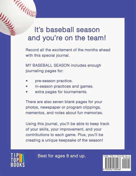 MY BASEBALL SEASON is a full-sized 8 ¿ x 11" sports journal that will help players record all the excitement of the months ahead. Each page has writing prompts to get players focused on the improvement of their skills and their contributions to each game. MY BASEBALL SEASON includes enough journaling pages for pre-season practice and in-season practices and games. Plus, there are extra pages for tournaments. There are also seven blank pages at the end for photos, statistics, newspaper or program clippings, mementos, or notes about fun memories. This unique journal helps kids: ¿Focus on the coach's priorities each week. ¿Improve as they track their performance. ¿Remember their season, their contributions, and all of their fun memories. And they'll be creating a unique keepsake of the season that they'll treasure for years to come! In addition, MY BASEBALL SEASON provides a fun way for kids to develop skills in writing, composition, grammar, vocabulary, spelling, sentence construction, and handwriting. (Best for ages 8 and up.) Baseball season will come and go in a blur. Get MY BASEBALL SEASON today so the kids you love can record and remember all the thrills and achievements of the season. MY SEASON journals are also available for softball, soccer, football, basketball, hockey, volleyball, and cheerleading.