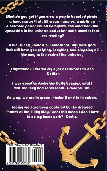 What do you get if you cross a purple bearded pirate, a headmaster that still wears nappies, a misfiring electronic parrot called Percylove, the most bed-like spaceship in the universe and saber tooth bunnies that love reading? A fun, funny, fantastic, fantastical, futuristic yarn that will have you yelping, laughing and clapping all the way to the ends of the universe. Frightened? I closed my eyes as I wrote this one. - Dr Nick I was about to stroke the fluffy bunnies, until I realised they had saber teeth. - Grandpa Tub No way, we are in space! - twins Li and La in unison Seeing we have been captured by the dreaded Pirates of the Milky Way, does this mean I don't have to do my homework? - Curtis