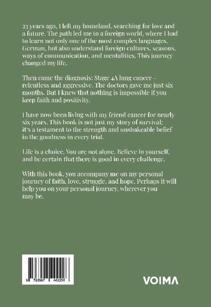Vor 23 Jahren verließ ich meine Heimat, auf der Suche nach Liebe und einer Zukunft. Der Weg führte mich in eine fremde Welt, wo ich nicht nur eine der komplexesten Sprachen, Deutsch, erlernen musste, sondern auch fremde Kulturen, Jahreszeiten, Kommunikationsweisen und Mentalitäten verstehen sollte. Diese Reise veränderte mein Leben.Dann kam die Diagnose: Stadium 4A Lungenkrebs - gnadenlos und aggressiv. Die Ärzte gaben mir nur noch sechs Monate. Aber ich wusste, dass nichts unmöglich ist, wenn man den Glauben und Positivität bewahrt.Ich lebe nun seit fast sechs Jahren mit meiner Freundin Krebs. Dieses Buch ist nicht nur meine Geschichte über das Überleben; es ist ein Zeugnis für die Kraft und den unerschütterlichen Glauben an das Gute in jeder Prüfung.Leben ist eine Wahl. Du bist nicht allein. Glaube an dich selbst, und sei sicher, dass es in jeder Herausforderung etwas Gutes gibt.Mit diesem Buch begleitest Du mich auf meiner persönlichen Reise des Glaubens, der Liebe, des Kampfes und der Hoffnung. Vielleicht hilft es Dir auf Deiner persönlichen Reise, wo immer Du auch gerade stehst.