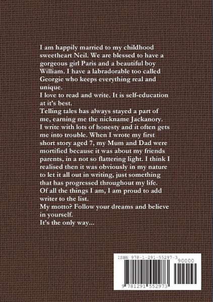 I am happily married to my childhood sweetheart Neil. We are blessed to have a gorgeous girl Paris and a beautiful boy William. I have a labradorable too called Georgie who keeps everything real and unique. I love to read and write. It is self-education at it's best. Telling tales has always stayed a part of me, earning me the nickname Jackanory. I write with lots of honesty and it often gets me into trouble. When I wrote my first short story aged 7, my Mum and Dad were mortified because it was about my friends parents, in a not so flattering light. I think I realised then it was obviously in my nature to let it all out in writing, just something that has progressed throughout my life. Of all the things I am, I am proud to add writer to the list. My motto? Follow your dreams and believe in yourself. It's the only way...