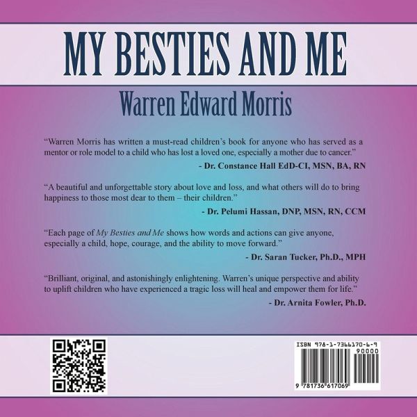 The story of My Besties and Me focuses on love, compassion, and sacrifice. You will feel the pain of the story as well as be inspired to think about what you can do to make a positive impact on a young person's life. During the loss of their mother to a disease, two young twin girls experience a tremendous amount of heartache that many of their friends cannot understand. In spite of the pain, they come to find love again in the people around them as they work through the pain. As this story demonstrates, one person can make a significant difference in the life of another. Throughout the book, words and actions are exemplified as providing hope, courage, and the ability to move forward for people of any age-especially children.