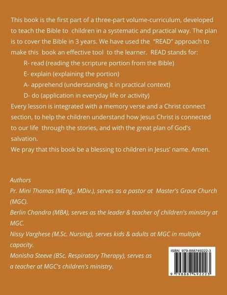 My Bible study book is the first part of a three-part volume- curriculum, developed to teach the Bible to children in a systematic and practical way. The plan is to cover the Bible in 3 years. We have used the "READ" approach to make this book an effective tool to the learner. READ stands for: R- read (reading the scripture portion from the Bible) E- explain (explaining the portion) A- apprehend (understanding it in practical context) D- do (application in everyday life or activity) Every lesson is integrated with a memory verse and a Christ connect section, to help the children understand how Jesus Christ is connected to our life through the stories, and with the great plan of God's salvation. We pray that this book be a blessing to children in Jesus’ name. Amen.