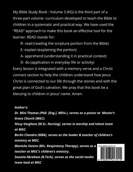 This book is the third of our three-volume curriculum, developed to teach the Bible and train children in a systematic and practical way. The plan is to cover the entire Bible in 3 years. Though there are many resources available, we developed this book to help children study the Bible, understand the Scriptures and learn how they can be practically applied to their daily life. We have used the READ approach to make this book be a very effective tool to the learner. You will notice that this approach is consistent across all the chapters and in every level and volume. READ stands for: R- Read (reading the Scripture Portion from the Bible) E- Explain (explaining the portion) A- Apprehend (understanding it in a practical context) D- Do (activity or application in everyday life)