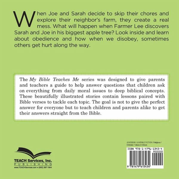 When Joe and Sarah decide to skip their chores and explore their neighbor's farm, they create a real mess. What will happen when Farmer Lee discovers Sarah and Joe in his biggest apple tree? Look inside and learn about obedience and how when we disobey, sometimes others get hurt along the way. The My Bible Teaches series was designed to give parents and teachers a guide to help answer questions that children ask on everything from daily moral issues to deep biblical concepts. These beautifully illustrated stories contain lessons paired with Bible verses to tackle each topic. The goal is not to give the perfect answer for everyone but to teach children and parents alike to get their answers straight from the Bible.