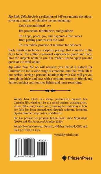 My Bible Tells Me So is a collection of 365 one-minute devotions, covering a myriad of relatable themes including: God's unconditional love His protection, faithfulness, and goodness The hope, peace, joy, and happiness that comes from putting your trust in the Lord The incredible promise of salvation for believers Each devotion includes a scripture passage that connects to the day's topic, the author's personal experiences (good and bad), how the subjects relate to you, the reader, tips to equip you and questions to think about. My Bible Tells Me So will reassure you that it is natural for Christians to feel a wide range of emotions, and that while life is not perfect, having a personal relationship with God will get you through the highs and lows with a constant protector, friend, and Father, making your journey lighter and more rewarding.