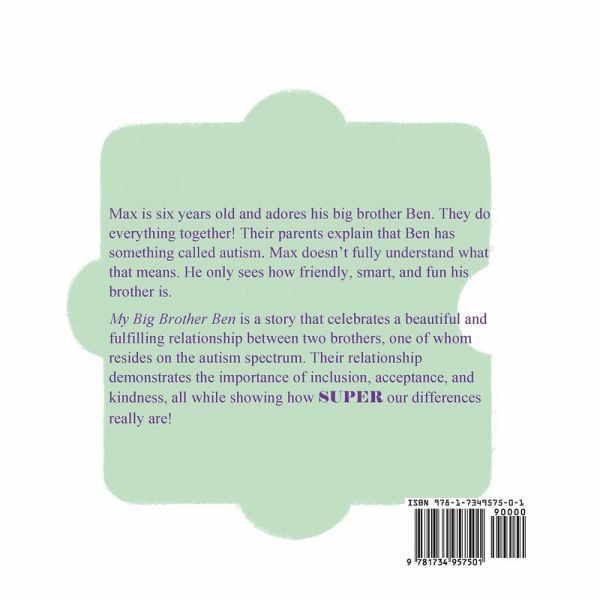 Max is six years old and adores his big brother Ben, they do everything together! His parents explain that Ben has autism. Max doesn't fully understand what that means, he only sees how friendly, smart, and fun his brother is. My Big Brother Ben is a story that celebrates a beautiful and fulfilling relationship between two brothers, one of whom resides on the autism spectrum. Their relationship demonstrates the importance of inclusion, acceptance, and kindness, all while showing how SUPER our differences really are!