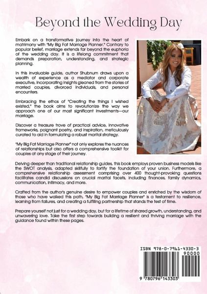 Embark on a transformative journey into the heart of matrimony with "My Big Fat Marriage Planner." Contrary to popular belief, marriage extends far beyond the euphoria of the wedding day. It is a lifelong commitment that demands preparation, understanding, and strategic planning. In this invaluable guide, author Shubnum draws upon a wealth of experience as a mediator and corporate executive, incorporating insights gleaned from the stories of married couples, divorced individuals, and personal encounters. Embracing the ethos of "Creating the things I wished existed," the book aims to revolutionize the way we approach one of our most significant investments-our marriage. Discover a treasure trove of practical advice, innovative frameworks, poignant poetry, and inspiration, meticulously curated to aid in formulating a robust marital strategy. "My Big Fat Marriage Planner" not only explores the nuances of relationships but also offers a comprehensive toolkit for couples at any stage of their journey. Delving deeper than traditional relationship guides, this book employs proven business models like the SWOT analysis, adapted skillfully to fortify the foundation of your union. Furthermore, a comprehensive relationship assessment comprising over 400 thought-provoking questions facilitates candid discussions on crucial marital facets, including finances, family dynamics, communication, intimacy, and more. Crafted from the author's genuine desire to empower couples and enriched by the wisdom of those who have walked this path, "My Big Fat Marriage Planner" is a testament to resilience, learning from failures, and creating a fulfilling partnership that stands the test of time. Prepare yourself not just for a wedding day, but for a lifetime of shared growth, understanding, and unwavering love. Take the first step towards building a resilient and thriving marriage with the guidance found within these pages.