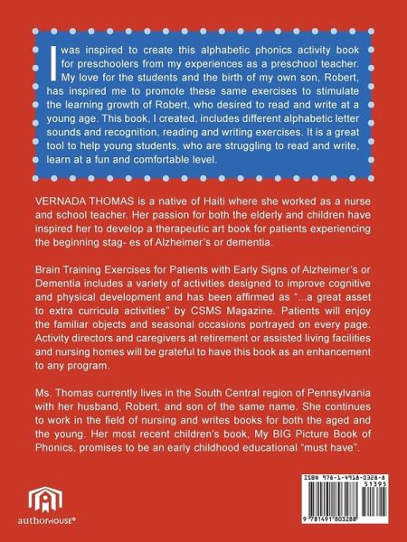 I was inspired to create this alphabetic phonics activity book for preschoolers from my experiences as a preschool teacher. My love for the students and the birth of my own son, Robert, has inspired me to promote these same exercises to stimulate the learning growth of Robert, who desired to read and write at a young age. This book, I created, includes different alphabetic letter sounds and recognition, reading and writing exercises. It is a great tool to help young students, who are struggling to read and write, learn at a fun and comfortable level.