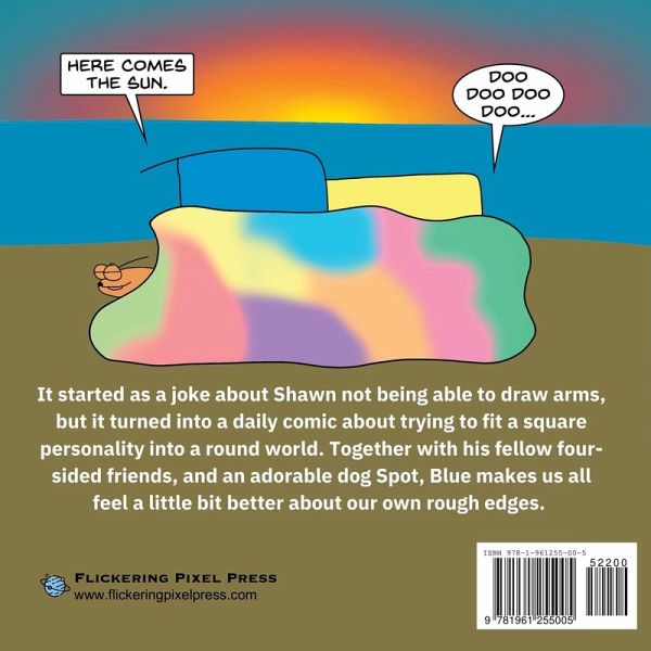 It started as a joke about Shawn not being able to draw arms, but it turned into a daily comic about trying to fit a square personality into a round world. Together with his fellow four-sided friends, and an adorable dog Spot, Blue makes us all feel a little bit better about our own rough edges.