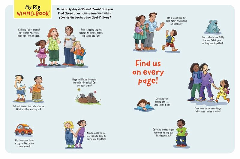 In these one-of-a-kind picture books, every page is bursting with life-and tons to discover! Children as young as age 2 have a blast pointing out recognizable things-a blue tricycle, a hungry dog, a piggyback ride-while older kids can follow the star characters from page to page, telling their stories along the way. How? Wimmelbooks are virtually instruction-free, inviting kids to make their own way through the busy Wimmelworld they encounter, and to craft their own stories. First, you're introduced to a unique cast of characters who are hidden in plain sight on the pages that follow. As you seek them out, each character's storyline unfolds, but it's up to kids to interpret the scenes and create stories they think fit. It's hours upon hours of fun-and an effortless introduction to literacy to boot. My Big Wimmelbook-A Day at School depicts an average day in the classroom for your typical early learner. From drop- off to recess to nap time-and, of course, learning everything from counting to spelling and more-every aspect of a typical school day is here, with a cast of unique and interesting kiddo characters (just like readers themselves!) to find and follow throughout their day. About Wimmelbooks Wimmelbooks originated in Germany decades ago and have become a worldwide sensation with children (and adults!) everywhere. My Big Wimmelbooks is the first-ever Wimmelbook series to feature Wimmelbooks as Wimmelbooks in English. They've been praised as "lively . . . and abounding with humor and detail" (WSJ), likely to "make any parent's heart sing." (NYT)