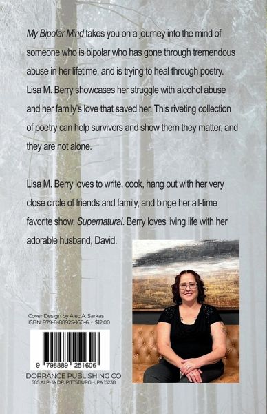 About the Book My Bipolar Mind takes you on a journey into the mind of someone who is bipolar who has gone through tremendous abuse in her lifetime, and is trying to heal through poetry. Lisa M. Berry showcases her struggle with alcohol abuse and her family's love that saved her. This riveting collection of poetry can help survivors and show them they matter, and they are not alone. About the Author Lisa M. Berry loves to write, cook, hang out with her very close circle of friends and family, and binge her all-time favorite show, Supernatural. Berry loves living life with her adorable husband, David