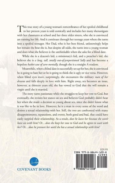 This true story of a young woman's remembrance of her spoiled childhood to her preteen years is told comically and includes her many shenanigans with her classmates at school and her three older sisters, who she is convinced are ruining her life. And it continues through her teenage years where she turns into a spoiled teenager. Her Dad, who is her best friend, unknowingly helps her remain the brat she is, but despite all odds, she turns into a young woman and does what she believes is the unthinkable when she asks for a blind date. While she is a deacon's kid, a missionary's kid, and a preacher's kid, she believes she is a long, tall, totally out-of-proportioned Sally and has become a hopeless basket case of zero mentally, though she is a straight A student. Meanwhile, when a blind date is successfully set up for her, she is convinced he is going to hate her or he is going to think she is ugly or vice versa. However, when blind eyes meet, surprisingly, she encounters the military man of her dreams and falls deeply in love with him. Right away, sex becomes an issue, however, at thirteen years old, she has vowed to God that she will remain a virgin until she is married. The story turns passionate while she struggles to keep her vow to God, but eventually, she revisits her stance on sex and believes God probably didn't hear her when she made a decision so young about sex, since she didn't know what it was like to be in love. However, he is a man in every sense of the word and desires a sexual relationship with her. Still, the two are confronted with many disappointments, separations, and events, both good and bad, that could have easily toppled their relationship. As a result, does he leave her because she won't have sex with him? Or...does she keep her vow to God and he agrees to wait with her? Or...does he pressure her until she has a sexual relationship with him?