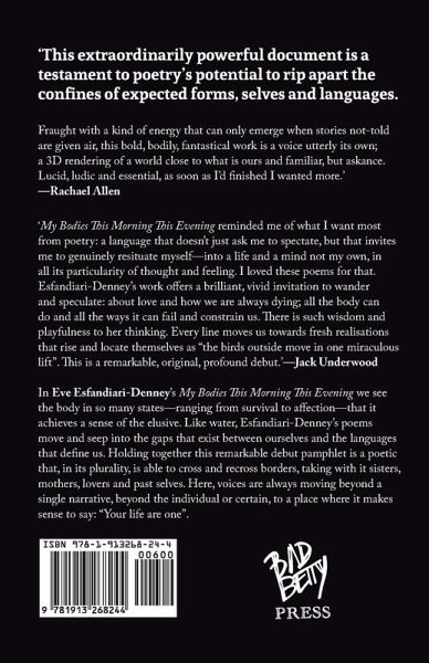 In Eve Esfandiari-Denney's My Bodies This Morning This Evening we see the body in so many states-ranging from survival to affection-that it achieves a sense of the elusive. Like water, Esfandiari-Denney's poems move and seep into the gaps that exist between ourselves and the languages that define us. Holding together this remarkable debut pamphlet is a poetic that, in its plurality, is able to cross and recross borders, taking with it sisters, mothers, lovers and past selves. Here, voices are always moving beyond a single narrative, beyond the individual or certain, to a place where it makes sense to say: "Your life are one".