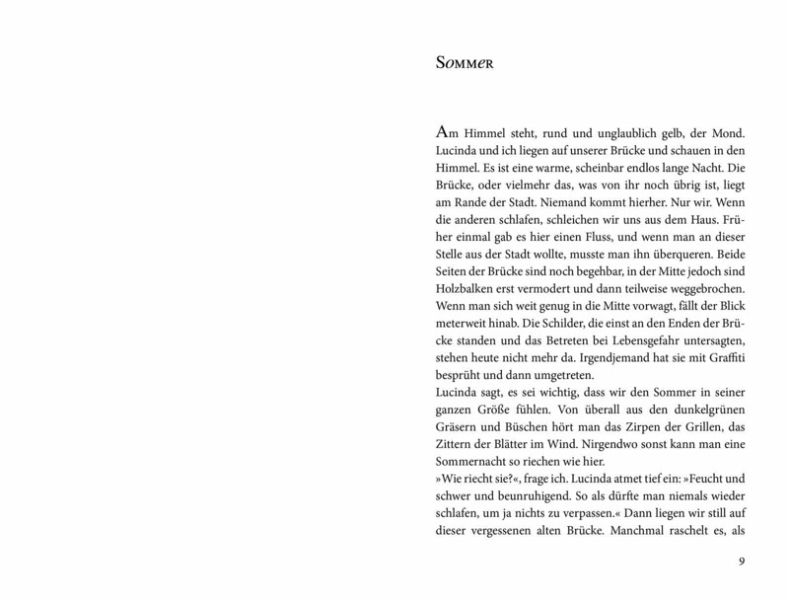 Malinas große Schwester Lucinda ist eine faszinierende Grenzgängerin. Sie kann leuchten wie ein Stern - und schrecklich herablassend sein. Dass sie im Herzen tieftraurig ist, weiß außer Malina niemand. Anfangs scheint Lucinda alles unter Kontrolle zu haben. Doch Malina bemerkt, dass Lucindas Spielchen immer krasser werden. Und dann passiert die schreckliche Sache mit ihrem Freund Jarvis, und Lucinda rast auf einen Abgrund zu.