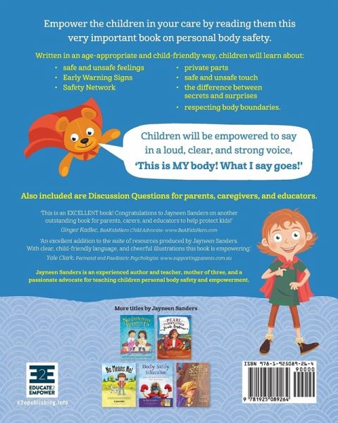 The crucial skills taught in this book will help children to protect their bodies from inappropriate touch. Children will be empowered to say in a strong and clear voice, "This is my body! What I say goes!" Through age-appropriate illustrations and engaging text this book, written by the author of 'No Means No!' and 'Some Secrets Should Never Be Kept', will teach children the following crucial and empowering skills in personal body safety: • identifying safe and unsafe feelings • recognizing early warning signs • developing a safety network • using the correct names for private parts • understanding the difference safe and unsafe touch • understanding the difference between secrets and surprises • respecting body boundaries. Approximately 20% of girls, and 8% of boys will experience sexual abuse before their 18th birthday (Pereda, et al, 2009). Parents, caregivers, and educators have a duty of care to protect children by teaching them Body Safety skills. These skills empower children, and go a long way in keeping them safe from abuse - ensuring they grow up as assertive and confident teenagers and adults. Also included in this book are in-depth Discussion Questions to further enhance the learning and to initiate important family conversations around body autonomy.