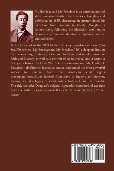 My Bondage and My Freedom is an autobiographical slave narrative written by Frederick Douglass and published in 1855, discussing in greater detail his transition from bondage to liberty. Douglass, a former slave, following his liberation went on to become a prominent abolitionist, speaker, author, and publisher. In his foreword to the 2003 Modern Library paperback edition, John Stauffer writes: "My Bondage and My Freedom," [is] a deep meditation on the meaning of slavery, race, and freedom, and on the power of faith and literacy, as well as a portrait of an individual and a nation a few years before the Civil War." As his narrative unfolds, Frederick Douglass-abolitionist, journalist, orator, and one of the most powerful voices to emerge from the American civil rights movement-transforms himself from slave to fugitive to reformer, leaving behind a legacy of social, intellectual, and political thought. The title includes Douglass's original Appendix, composed of excerpts from the author's speeches as well as a letter he wrote to his former master.