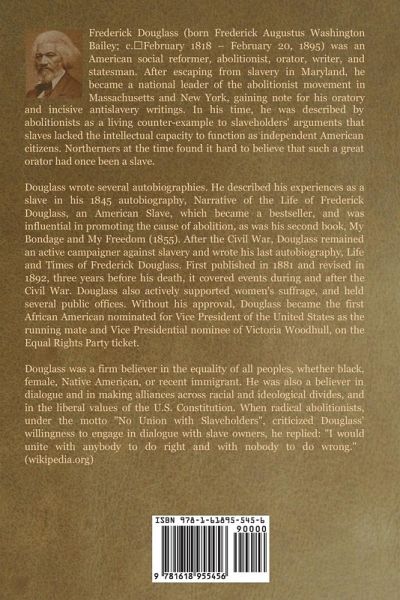 Frederick Douglass (born Frederick Augustus Washington Bailey; c. February 1818 – February 20, 1895) was an American social reformer, abolitionist, orator, writer, and statesman. After escaping from slavery in Maryland, he became a national leader of the abolitionist movement in Massachusetts and New York, gaining note for his oratory and incisive antislavery writings. In his time, he was described by abolitionists as a living counter-example to slaveholders' arguments that slaves lacked the intellectual capacity to function as independent American citizens. Northerners at the time found it hard to believe that such a great orator had once been a slave. Douglass wrote several autobiographies. He described his experiences as a slave in his 1845 autobiography, Narrative of the Life of Frederick Douglass, an American Slave, which became a bestseller, and was influential in promoting the cause of abolition, as was his second book, My Bondage and My Freedom (1855). After the Civil War, Douglass remained an active campaigner against slavery and wrote his last autobiography, Life and Times of Frederick Douglass. First published in 1881 and revised in 1892, three years before his death, it covered events during and after the Civil War. Douglass also actively supported women's suffrage, and held several public offices. Without his approval, Douglass became the first African American nominated for Vice President of the United States as the running mate and Vice Presidential nominee of Victoria Woodhull, on the Equal Rights Party ticket. Douglass was a firm believer in the equality of all peoples, whether black, female, Native American, or recent immigrant. He was also a believer in dialogue and in making alliances across racial and ideological divides, and in the liberal values of the U.S. Constitution. When radical abolitionists, under the motto "No Union with Slaveholders", criticized Douglass' willingness to engage in dialogue with slave owners, he replied: "I would unite with anybody to do right and with nobody to do wrong." (wikipedia.org)