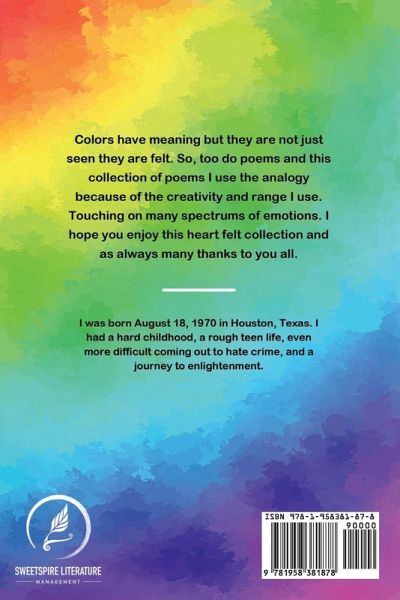 Colors have meaning but they are not just seen they are felt. So, too do poems and this collection of poems I use the analogy because of the creativity and range I use. Touching on many spectrums of emotions. I hope you enjoy this heart felt collection and as always many thanks to you all.