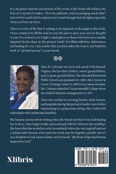It is my prayer that the enrichment of the words in this book will enhance the lives of a myriad of readers. The rich, authentic, and encouraging words that I have written could only be inspired and created through God Almighty, especially when you hear my story. There is a river of life that is waiting to be explored on the pages in this book. I have created it to fill the void in your life and to open your eyes to the gifts in you. It is written to be a light in dark places to those who have been visually impaired by the chaos in this present world. It is filled with love, deliverance, and healing for you. I am ecstatic that you have taken the time to just hold this book of "spiritual poems" in your hands.