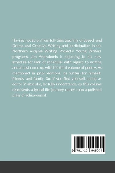 Having moved on from full-time teaching of Speech and Drama and Creative Writing and participation in the Northern Virginia Writing Project's Young Writers programs, Jim Andrukonis is adjusting to his new schedule (or lack of schedule) with regard to writing and at last come up with his third volume of poetry. As mentioned in prior editions, he writes for himself, friends, and family. So, if you find yourself acting as editor in absentia, he fully understands, as this volume represents a lyrical life journey rather than a polished pillar of achievement.
