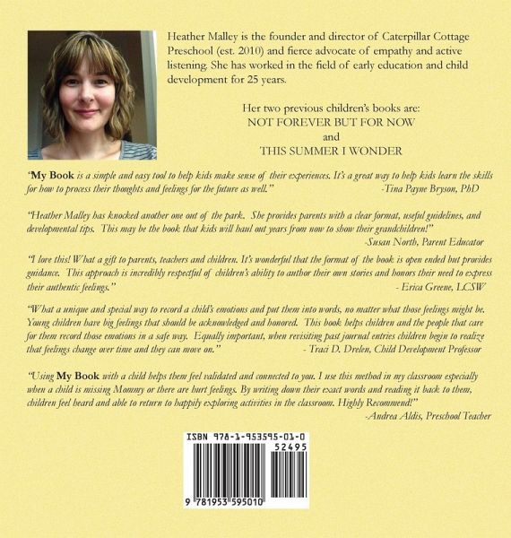 Give a child (age 2-7) the gift of their own book bound like the others on their book shelf containing their own thoughts, stories and feelings. This journal for your young child's stories and pictures offers a way to connect by writing down their words while boosting their own interest in writing and reading. The book has room for you to record 20 of your child's stories or experiences with pages for their drawings. A guide at the end gives parents, caregivers, or teachers helpful advice about how to begin this process with young children. Parenting and early childhood experts value and often suggest making empathy books for young children. This book provides one way to do that. This book has 20 pages lined for words paired with 20 blank picture pages. A guide at the end gives parents, caregivers, or teachers helpful advice about how to begin this process with young children. "I love this! What a gift to parents, teachers and children. It's wonderful that the format of the book is open ended but provides guidance. This approach is incredibly respectful of children's ability to author their own stories and honors their need to express their authentic feelings." - Erica Greene, LCSW "This personalized, bound copy takes your child's musings and artwork to the next level. Malley provides parents with a clear format, useful guidelines, and developmental tips. This may be the book that kids now in preschool or kindergarten will haul out years from now to show their grandchildren!" - Susan North, Parent Educator "Using My Book with a child helps them feel validated and connected to you. I use this method in my classroom... When a child is upset, writing down their exact words and reading it back allows them to feel heard and able to return to happily exploring activities in the classroom or at home. Highly Recommend!" - Andrea Aldis, Preschool Teacher
