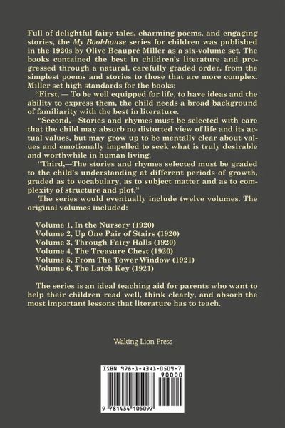 Full of delightful fairy tales, charming poems, and engaging stories, the My Bookhouse series for children was published in the 1920s by Olive Beaupré Miller as a six-volume set. The books contained the best in children's literature and progressed through a natural, carefully graded order, from the simplest poems and stories to those that are more complex. Miller set high standards for the books: "First,-To be well equipped for life, to have ideas and the ability to express them, the child needs a broad background of familiarity with the best in literature. "Second,-Stories and rhymes must be selected with care that the child may absorb no distorted view of life and its actual values, but may grow up to be mentally clear about values and emotionally impelled to seek what is truly desirable and worthwhile in human living. "Third,-The stories and rhymes selected must be graded to the child's understanding at different periods of growth, graded as to vocabulary, as to subject matter and as to complexity of structure and plot." The series would eventually include twelve volumes. The original volumes included: Volume 1, In the Nursery (1920) Volume 2, Up One Pair of Stairs (1920) Volume 3, Through Fairy Halls (1920) Volume 4, The Treasure Chest (1920) Volume 5, From The Tower Window (1921) Volume 6, The Latch Key (1921) The series is an ideal teaching aid for parents who want to help their children read well, think clearly, and absorb the most important lessons that literature has to teach. This volume, a facsimile of the original 1920 edition of Up One Pair of Stairs, features classic stories from around the world. It also features the color illustrations included in the original edition of the book. It is printed on acid-free, archival-quality paper for durability and long use.