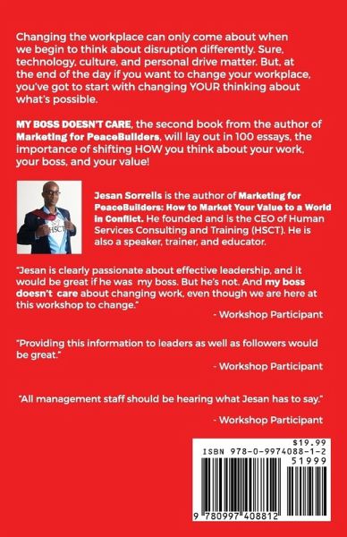 My Boss Doesn't Care is the 2nd book from Jesan Sorrells, author of Marketing for PeaceBuilders: How to Market Your Value To A World In Conflict. Changing a work culture is hard. Change can only come about when we begin to think differently about the kind of disruption we actually want. Sure, technology, culture, and personal drive at work matter. But, at the end of the day, if you want to change your workplace, you've got to start by changing YOUR thinking about what's possible. In this book, Jesan answers the never-ending question of how to change organizational cultures, not through changing jobs, but through changing your mind about your work, your boss, and even yourself!