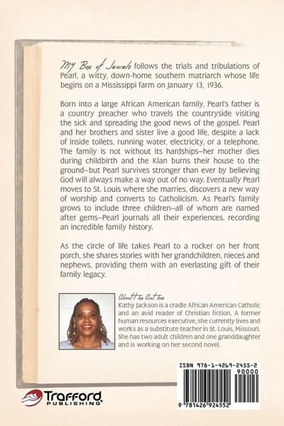My Box of Jewels follows the trials and tribulations of Pearl, a witty, down-home southern matriarch whose life begins on a Mississippi farm on January 13, 1936. Born into a large African American family, Pearl's father is a country preacher who travels the countryside visiting the sick and spreading the good news of the gospel. Pearl and her brothers and sisters live a good life, despite a lack of inside toilets, running water, electricity, or a telephone. The family is not without its hardships-her mother dies during childbirth and the Klan burns their house to the ground-but Pearl survives stronger than ever by believing God will always make a way out of no way. Eventually Pearl marries and moves to St. Louis where she discovers a new way of worship and converts to Catholicism. As Pearl's family grows to include three children-all of whom are named after gems-Pearl journals all their experiences, recording an incredible family history. As the circle of life takes Pearl to a rocker on her front porch, she shares the story of her life with her grandchildren, nieces, and nephews, providing them with an everlasting gift of her legacy.
