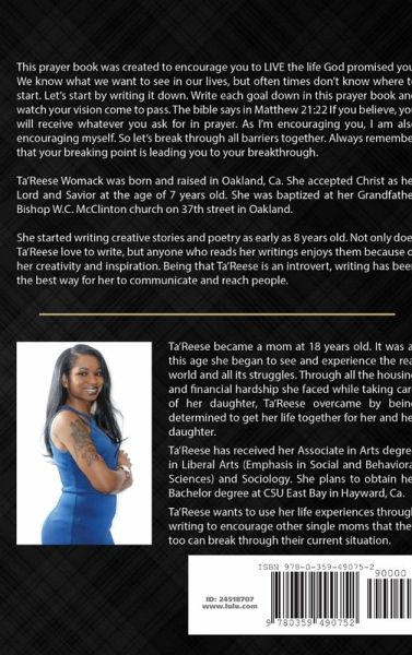 This prayer book was created to encourage you to LIVE the life God promised you. We know what we want to see in our lives, but often times don't know where to start. Let's start by writing it down. Write each goal down in this prayer book and watch your vision come to pass. The bible says in Matthew 21:22 If you believe, you will receive whatever you ask for in prayer. As I'm encouraging you, I am also encouraging myself. So let's break through all barriers together. Always remember that your breaking point is leading you to your breakthrough.