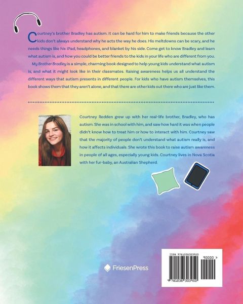 Courtney's brother Bradley has autism. It can be hard for him to make friends because the other kids don't always understand why he acts the way he does. His meltdowns can be scary, and he needs things like his iPad, headphones, and blanket by his side. Come get to know Bradley and learn what autism is, and how you could be better friends to the kids in your life who are different from you. My Brother Bradley is a simple, charming book designed to help young kids understand what autism is, and what it might look like in their classmates. Raising awareness helps us all understand the different ways that autism presents in different people. For kids who have autism themselves, this book shows them that they aren't alone, and that there are other kids out there who are just like them.