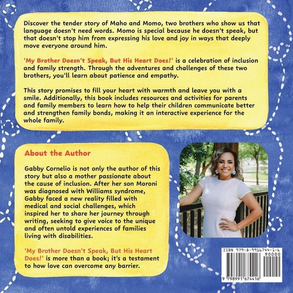 I am Gaby Cornelio, an author and full-time mother. Over the years, I have dedicated myself to sharing my passion for nutrition and wellness, while also offering a glimpse into my family life through social media. However, when my son Moroni was born with medical complications and underwent multiple surgeries, I left everything behind to focus completely on his care for four years. During that time, I became his advocate and an ambassador for inclusion, fighting for his rights and seeking the necessary resources for his health and well-being.In the most difficult moments, when I felt sadness over his health, surgeries, and recovery, I found healing through art and watercolor painting. Art became a way to heal my soul and distract myself, helping me overcome many challenges, which is why I decided to illustrate my own stories.Currently, I am pursuing a Bachelor's degree in Health Sciences. Being surrounded by doctors, specialists, therapists, and countless medical situations and diagnoses with my son Moroni, I developed a deep desire to learn more about health-a field that I live with daily. I want to gain a stronger understanding of these topics to apply them in my life and help others.Today, I share our stories with the hope of inspiring others, promoting empathy, family love, and a positive perspective on disability. Through my books, I aim to support other families facing similar challenges and show them that, although the obstacles may be great, there are always ways to grow and love more deeply.