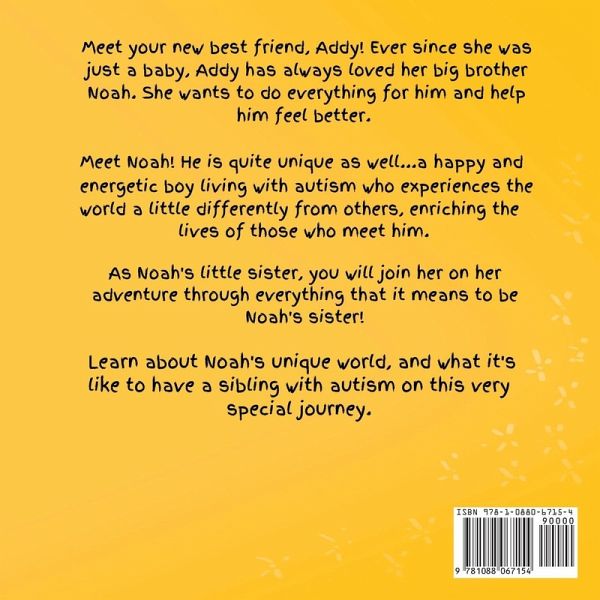 Meet your new best friend, Addy! Ever since she was just a baby, Addy has always loved her big brother Noah. She wants to do everything for him and help him feel better. Meet Noah! He is quite unique as well...a happy and energetic boy living with autism who experiences the world a little differently from others and enriches the lives of those who meet him. As Noah's little sister, you will join her on her adventure through everything that it means to be Noah's sister! Learn about Noah's unique world, and what it's like to have a sibling with autism on this very special journey.