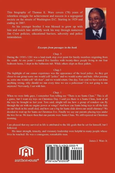 This biography of Thomas E. Ware covers (78) years of relentless struggle for achievement and success in a segregated society on the streets of Washington D.C. Starting in 1929 and ending in 2007. As his younger brother I was blessed to grow up with him and watch him skillfully work his way through numerous Jim Crow policies, educational barriers, adversity and police intimidation. (Excerpts from passages in the book) Chap. 5 During the 1930's 1201 was a land mark stop over point for family members migrating from the south. At one point I counted five families with twenty-three people living in our four bedroom home, I slept in the bathroom tub. While others slept on floor pallets. Chap.3 The highlight of our corner experience was the appearance of the local police. As they got closer to our group some one would yell "police" and we would scatter and hide. After passing us, some one would yell "all clear", and we would return. One day, Tom said we have not done anything wrong, why should we run every time we see a policeman? I'm not going to run anymore! Nervously, I sat with him. Chap. 1 When we were little guys, I remember Tom telling me "There is no Santa Claus." This is all a game, but I want my toys on Christmas Day. I said yes there is a Santa Claus, look at all the toys he brought us last year. Tom said; alright tell me how a group of reindeer can fly through the air with no engine power or wings? And how can Santa bring toys to all the kids on our block in his small sled, and how can a big fat Santa slide down our small chimney? We decided to wait up for Santa on Christmas Eve. Finally we say our parents placing toys under the tree for us. We knew then that our parents were Santa Claus. We still rejoiced on Christmas morning. I am pleased that my survival in life is attributed to the life goals that he set for himself, but I followed. His inner strength, tenacity, and visionary leadership were helpful to many people whose