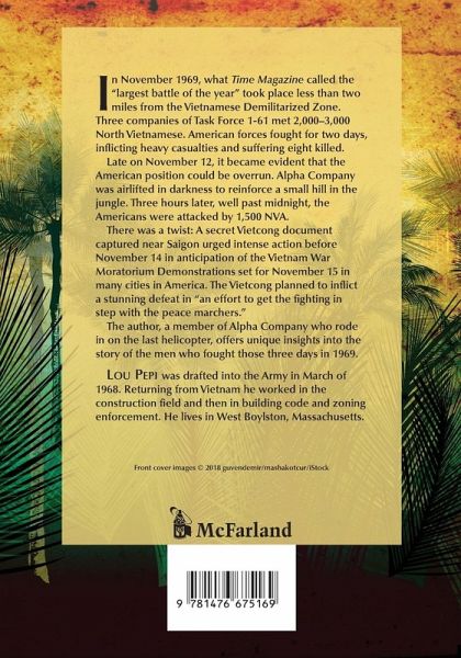 In November 1969, what Time Magazine called the "largest battle of the year" took place less than two miles from the Vietnamese Demilitarized Zone. Three companies of Task Force 1-61 met 2,000-3,000 North Vietnamese. American forces fought for two days, inflicting heavy casualties and suffering eight killed. Late on November 12, it became evident that the American position could be overrun. Alpha Company was airlifted in darkness to reinforce a small hill in the jungle. Three hours later, well past midnight, the Americans were attacked by 1,500 NVA. There was a twist: A secret Vietcong document captured near Saigon urged intense action before November 14 in anticipation of the Vietnam War Moratorium Demonstrations set for November 15 in many cities in America. The Vietcong planned to inflict a stunning defeat in "an effort to get the fighting in step with the peace marchers." The author, a member of Alpha Company who rode in on the last helicopter, offers unique insights into the story of the men who fought those three days in 1969.