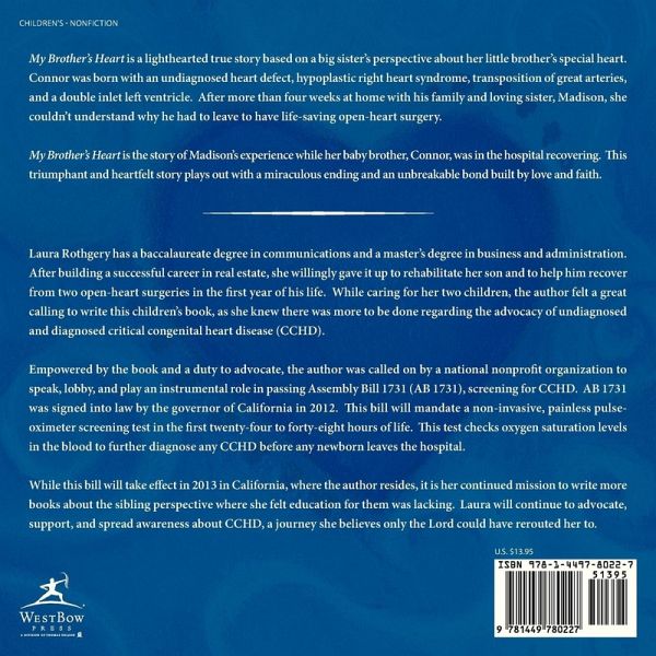 My Brother's Heart is a lighthearted true story based on a big sister's perspective about her little brother's special heart. Connor was born with an undiagnosed heart defect, hypoplastic right heart syndrome, transposition of great arteries, and a double inlet left ventricle. After more than four weeks at home with his family and loving sister, Madison, she couldn't understand why he had to leave to have life-saving open-heart surgery. My Brother's Heart is the story of Madison's experience while her baby brother, Connor, was in the hospital recovering. This triumphant and heartfelt story plays out with a miraculous ending and an unbreakable bond built by love and faith.