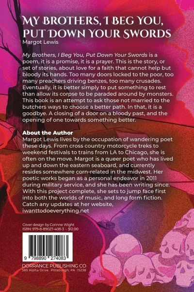 My Brothers, I Beg You, Put Down Your Swords is a poem, it is a promise, it is a prayer. This is the story, or set of stories, about love for a faith that cannot help but bloody its hands. Too many doors locked to the poor, too many preachers driving benzes, too many crusades. Eventually, it is better simply to put something to rest than allow its corpse to be paraded around by monsters. This book is an attempt to ask those not married to the butchers ways to choose a better path. In that, it is a goodbye. A closing of a door on a bloody past, and the opening of one towards something better. About the Author Margot Lewis lives by the occupation of wandering poet these days. From cross country motorcycle treks to weekend festivals to trains from LA to Chicago, she is often on the move. Margot is a queer poet who has lived up and down the eastern seaboard, and currently resides somewhere corn-related in the midwest. Her poetic works began as a personal endeavor in 2011 during military service, and she has been writing since. With this project complete, she sets to jump face first into both the worlds of music, and long form fiction. Catch any updates at her website, iwanttodoeverything.net