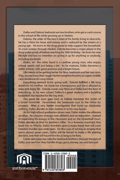 Dallas and Dakota Seabrook are two brothers who get a crash course in the school of life while growing up in Harlem. Dakota, the older of the two is tired of his family living in obscurity. He has a thirst for fame and money and is seduced by the streets at a young age. He turns to the drug game to help support the household. As crack sweeps through Harlem, Dakota becomes a major player in the drug underworld, all before reaching his 18th birthday. He loves his new lifestyle and has no intention on giving it up for anything or anybody, including his family. Dallas, on the other hand is a carefree young man, who enjoys school, sports and just being a kid. As he matures, Dallas becomes a stellar athlete, with great promise and a bright future. Life seems to be getting better for Nora Seabrook and her two sons. They moved from their rough Harlem neighborhood to an upper middle class residence on Long Island. Everything seemed to be going well. Dakota fulfilled a life long dream for his mother. He made her a homeowner and she is allowed to relax and enjoy life. Dakota made sure Nora and Dallas had the best of everything. In his new school, Dallas is a great student and a budding basketball star headed for the big time. The good life soon goes bad, as Dakota becomes the victim of a brutal homicide. Devastated, the Seabrooks turn to the Police for answers. After a very feeble investigation that turns up absolutely nothing, Dallas decides to take matters in to his own hands. As his high school graduation draws near, Dallas makes the ultimate sacrifice. He chooses revenge over athletics and an education. Instead of expending his energy in the classroom and on the basketball court, Dallas decides to find his brother's killer. In a feverous manhunt that leads him to Atlanta, Dallas stumbles upon a major break that will crack Dakota's murder case wide open. On the cusp of solving an enigma that spans almost seven years, Dallas will be forced to m