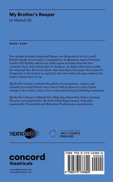 Two refugee brothers Aman and Hassan are dispersed to live in a small British seaside town hostile to immigration. In desperate need of business, hotelier Bill Bradley and his son Aidan agree to house them but face animosity from their community for doing so. As Aidan takes Aman under his wing and they draw ever closer, they soon learn the utopia they create for themselves in the hotel is no match for the real world and must confront the hostile climate they live in. My Brother's Keeper explores the politics of immigration, religion and sexuality as a small British town tries to find its place at a time of great change in the world; a story of love, pain and learning in building community. My Brother's Keeper is Mahad Ali's debut play directed by Robert Awosusi. The play was longlisted for the 2018 Alfred Fagon Award. Originally presented by Theatre503 and Relentless Productions co-production.
