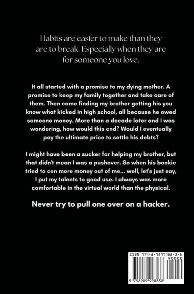 Habits are easier to make than they are to break. Especially when they are for someone you love. It all started with a promise to my dying mother. A promise to keep my family together and take care of them. Then came finding my brother getting his you know what kicked in high school, all because he owed someone money. More than a decade later and I was wondering, how would this end? Would I eventually pay the ultimate price to settle his debts? I might have been a sucker for helping my brother, but that didn't mean I was a pushover. So when his bookie tried to con more money out of me... well, let's just say, I put my talents to good use. I always was more comfortable in the virtual world than the physical. Never try to pull one over on a hacker.