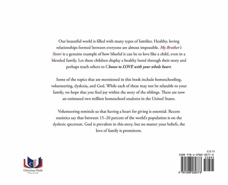 Our beautiful world is filled with many types of families. Healthy, loving relationships formed between everyone are almost impossible. My Brother's Sister is a genuine example of how blissful it can be to love like a child, even in a blended family. Let these children display a healthy bond through their story and perhaps teach others to Choose to LOVE with your whole heart. Some of the topics that are mentioned in this book include homeschooling, volunteering, dyslexia, and God. While each of these may not be relatable to your family, we hope that you find joy within the story of the siblings. There are now an estimated two million homeschool students in the United States. Volunteering reminds us that having a heart for giving is essential. Recent statistics say that between 15-20 percent of the world's population is on the dyslexic spectrum. God is prevalent in this story, but no matter your beliefs, the love of family is prominent.